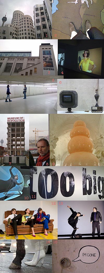 реконструированном здании К21 на пруду. Одна из выставок расположена на набережной Рейна, неподалёку от модного райончика "медиального портового квартала" со зданиями Гери (иллюстр. 1), приличным баром "Лидо" и небольшой экспозиционной площадки Kai10 (инсталляция Rémy Markowitsch - иллюстр. 2), и занимает любопытное пространственно трубы-туннеля бывшего подземного перехода - а ныне помещения выставочного зала Kunst im Tunnel - он же KIT. Высота зала KIT с одной стороны трубы сходит практически на нет, что побуждает каждого посетителя опробовать тактильное соотношения собственной головы и потолка помещения (иллюстр. 5). Кроме предоставления возможности пространственного экспериментирования, KIT, под кураторским руководством Gertrud Peters, представляет на Quadriennale экспозицию Björnа Dahlemа "Celestial theory I – the Milky Way". Björn Dahlem попытается выстроить в интерьере с раскидаными пенопластовыми островами, рифами и витринами с мистически-причудливыми "научными" объектами космического происхождения (иллюстр. 6) систему, напоминающую о дальних галактиках. При детальном рассмотрении космических объектов радуют и греют душу землянина компоненты их составляющие: хрустальные вазочки, стекляные люстрочки, обломки бытовой техники и прочие банальные и до боли знакомые вещицы, срастающиеся в непонятные никому не нужные и неопозноваемые объекты (следующее приземление которых запланировано в Kunsthalle Wien). Безусловно слегка наивные, но очень симпатичные творения "Milky Way", а также архитектурно-необычное 888-квадратметровое пространство Kunst im Tunnel смотреть стоит. По другую левую сторону Рейна, слегка в стороне от городского центра, расположена вторая запоминающаяся выставка дюссельдорфской Quadriennale. Постиндустриальное здание, в котором разместилась четвёртая по счёту экспозиция Julia Stoschek Collection, и вдобавку квартирный домик Юлии, которая живёт на крыше (иллюстр. 3) - объект, который непременно стоит посетить. Во-первых - как один из немногочисленных представителей редковстречающейся особи "видео-коллекции" и во-вторых - как одну из редких возможностей просмотреть практически все существующие 8мм-ые фильмы Derekа Jarmanа в котексте экспозиции "Number Four: Derek Jarman - Super8" под кураторским надзором от Philipp Fürnkäs. Derek Jarman - британский художник 1942-го года рождения, сценарист, режиссёр и сопутник таких фигур как Тилда Свинтон, более известен широкой публике своими полноформатными фильмами и менее - творениями Super8, отснятыми в период с 1978-го до смерти Дерека в 1994-ом году. Сверхперсонализированные ленты, по утверждению автора - cinema of small gestures, крутятся вокруг и около темы искусства и достаточно символичны и автобиографичны. Открытое пространство второго этажа здания заполнено 11-ю проекциями, тонущими в ритуальных мистификациях и странных ландшафтах, такие как серия "Art of Mirrors I-III" (на любителя). Просмотр "Number Four: Derek Jarman - Super8" завершается в небольшом и уютном кинозале в подвале здания финальной работой Дерека в синей елегии 1993-го года “Blue”. Но самым интересным остаётся первый этаж с 12-ю дигитализированными фильмами, повествующими о субкультурном окружении автора и разбросанными по большим и меньшим перетекающим помещениям зала (иллюстр. 4). Небольшой недостаток - запланированное посещение нужно заранее обговорить с ответственными лицами (позвоните Филипу и скажите, что вы от меня:-), а также продолжительные временные затр