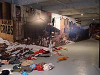 «Одиссея таракана» – это инсталляция, состоящая из гротескных объектов в обрамлении фотоизображений жизни современного мегаполиcа. Цветные фотографии во всю стену, размером с рекламный щит, показывают суровую жизнь улиц: кровавое убийство, дом, разрушенный бомбежкой, голодающего ребенка. Гигантские предметы: шестифутовая урна для мусора, заполненная обломками гипсовых тел, неправдоподобно большая модель мышеловки для людей, сотни сношенных и выброшенных туфель, хозяева которых давно забыты, – транслируют тот же драматический сюжет. «Одиссея таракана» – странствующий выставочный проект: в октябре 2003 года он был впервые показан в Галерее Джеффри Дейча в Нью-Йорке, затем – февраль-март 2004 – в Институте современного искусства в Лондоне. |