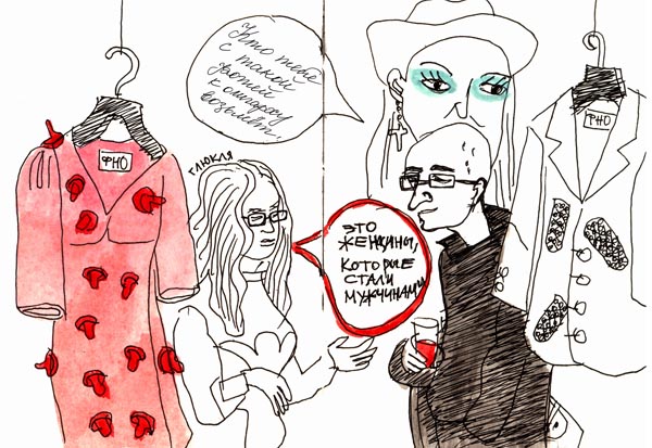 Глюкля и Цапля, сокрывшись от назойливой охраны за розовым платьем с красными сосками, распивали коньяк и рассказывали о новом фильме, в котором «у каждой девушки будет член». «Согласны ли вы, что у нас есть метафизические члены?», - спрашивали они меня и Оксану Саркисян. «Согласны», - отвечали мы, попивая коньяк. «Влюблены ли вы?» - спрашивали питерские волшебницы, «Я привезу тебе новое платье, лазоревое, с воротничком в виде фаллоса» - обещала мне Глюкля.