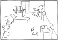 В совокупности размышлений о соседке Люде, о чистоте, белизне и стерильности, о внутренностях и офисности, учитывая несоразмерность пространства галерейному, и снятую с повестки дня проблему вынесения из  работ из мастерской  я решила, что это идеальная ситуация для создания в этом месте "Схемы пространства №11" - "Кабинет."  «Кабинет» доврачебный, процедурный, медицинский, больничный клинический.