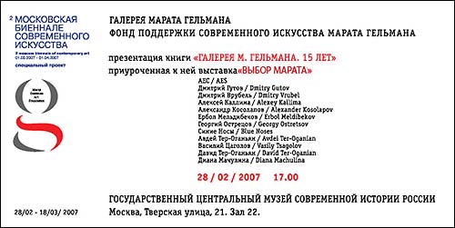 ![]() <Открытие 1 марта. Основной проект на 19- 20 этажах башни Федерация. 19 этаж справа, примерно в четверти высоты башни от земли, светится фиолетовым. Это светится "Aurora" Карнеллы Гросс (Carmela Gross). Далее здесь> <<Московская биеннале современного искусства c 1 марта по 1 апреля 2007 года. Тема биеннале «Геополитика, рынки, амнезия. ПРИМЕЧАНИЯ». Кураторы: Иосиф Бакштейн, Николя Буррио, Даниэль Бирнбаум, Яра Бубнова и Роза Мартинес> <Экспозиции выставок Основного проекта представлены в Торговом центре ЦУМ и Башне Федерации> <В рамках программы «Специальные гости биеннале» подготовлены выставочные проекты всемирно известных художников – Даррена Алмонда, Пипилотти Рист, Джеффа Уолла, Вали Экспорт, Луки Панкрацци, Комара и Меламида. Кроме того: ретроспектива Пьера и Жиля, фильмы Мэтью Барни, проекты «Верю», «Движение, эволюция, искусство», «Соц-арт. Политическое искусство в России и в Китае», «Мыслящий реализм», Art Digital 2006 и другие> <Программа специальных проектов Второй Московской биеннале ставит перед собой задачу познакомить зрителей с современным искусством в России и в мире. <<В галерее pop/off/art 5 – 31 марта. Кирилл Чёлушкин «Все, что я успел понять о свете и тени». Деловой центр «Знаменка», ул. Знаменка, 7, с.1 ![]() <<С 6 марта по 1 апреля в Музейном центре РГГУ "54 зимы Никиты Алексеева". Ул. Чаянова, 15, РГГУ, главный вход, выставочный зал, 2 этаж. 12 января 2007 года Никите Алексееву исполнилось 54. Ему теперь 54 зимы. ![]() Большое панно сопровождают сорок два маленьких рисунка, каждый из них снабжен объяснением, что исторически важного случилось в ту или иную зиму. Например, в 1953 было сфабриковано «Дело врачей», а в 2000 Путин стал президентом, в 2007 пока не случилось ничего заслуживающего внимания. <<2 марта на территории Винзавода стартует несколько проектов специальной программы II Московской биеннале современного искусства: ![]() - специальный гость Дарен Альмонд "Если бы ты был рядом". 4 корпус, хранилище вермута; - "Мы ваше будущее". Кураторы: Итан Коэн и Хуан Пунтес. 2 корпус, акцизный склад; - "Материя и Память". Кураторы: Станислав Шурипа и Рене Падт. 3 копус, подваля коньячного цеха; ![]() - "Верю". Куратор Олег Кулик, уже n-е открытие, скорее еще одна возможность посмотреть экспозицию толпой. 6 корпус, большое винохранилище> <<12 марта Клуб СИНЕ ФАНТОМ открывает серию кинопоказов "Шедевры научно популярного кино" - ретроспективу Владимира Кобрина. В программе показов 12, 13, 14 марта - показы фильмов Владимира Кобрина, созданных в 80-90-х годах, а также - 14 марта - Знаменитые обсуждения киноклуба СИНЕ ФАНТОМ с участием кинокритиков, соратников и учеников Владимира Кобрина. 8 марта Владимиру Кобрину исполнилось бы 65 лет. Его творчество сравнивали с фильмами Льва Кулешова, Дзиги Вертова, с поэзией Велимира Хлебникова и Осипа Мандельштама. Кобрин Владимир Михайлович - кинооператор по специальности, выпускник ВГИК, работал на московской киностудии "Центрнаучфильм". С 1977 г. - режиссер, художник, сценарист. Поставил в общей сложности 35 картин (20 из них - образовательные - по химии, физике, биологии). С 1989 г. практиковал совмещение традиционной кинотехнологии с экспериментальной компьютерной обработкой изображения. Фильмы Кобрина, которые академик Капица показал в телепередаче "Очевидное - невероятное", вызвали удивленное восхищение множества телезрителей. После этого Владимир Кобрин получил з