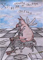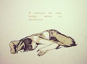 и сон - утопический мираж.<<22 февраля - 10 марта в ЦДХ, в залах 5, 8 и 9 выставка Пьерика Сорена (Pierrick Sorin) "Видеопрыжок". Российский зритель не слишком избалован информацией о французском искусстве второй половины ХХ века. Кроме Кристиана Болтански и Пьера Сулажа, ни один из ведущих французских художников не имел в Москве персональной выставки. Поэтому, Центральный Дом Художника вместе с Посольством Франции и Французским культурным центром давно запланировали показ работ французского художника, чье творчество было бы показательно для французского искусства сегодняшнего дня. Выбор пал на Пьерика Сорена – лауреата премии Марселя Дюшана; он не раз представлял Францию на крупнейших международных форумах, таких, как биеннале в Сан-Пауло и Венецианскоеой биеннале. ![]() Пьерик Сорен принадлежит к европейской традиции, идущей от дадаизма и Флаксус и имеющей на российской арт-сцене своих последователей. Среди них: Мухоморы, Чемпионы Мира, Авдей Тер-Оганян, ПГ, Синие Носы. Характерной чертой этой традиции является автор-персонаж, стратегия которого – пересмешничество. При этом сам пересмешник не боится предстать в нелепом свете. В отличие от американского искусства, где укоренена идея художника-звезды, это традиция представляет маргинального художника-неудачника, вечно терпящего фиаско. Однако антигерой проявляет важные аспекты социо-культурной ситуации. Герои-двойники Пьерика Сорена наподобие Чарли Чаплина помещаются художником-режиссером в разные ролевые ситуации. Они предстают теле- и рок-звездами, художниками современного искусства, коллекционерами, безработными. Иногда они помещаются автором в крайне деликатные эротические ситуации. В своих работах Пьерик Сорен одновременно производит и пародирует произведения современного искусства. Во всех его перформансах присутствует иронический подтекст. Перформанс подпитан эксцентрической эстетикой трюков и гэгов немого кино. Так родились «маленькие человечки», ставшие героями особого жанра, созданного художником – оптического театрика. Искусство Сорена стоит на жанрово-тематическом перекрестке между религиозными мистериями и площадным театром, тинейджерскими состязаниями и панк-концертами. ПОДРОБНЕЕ> <<23 февраля - 9 марта в галерее Кино «Судьбы сплетенье» - А. Фонвизин, А. Белякова (графика, литография). Алла Белякова дружила со многими замечательными людьми своего времени, поэтами и музыкантами. Возможно, музыкальный гений Генриха Нейгауза или Святослава Рихтера нашел отражение в той особой музыкальной атмосфере ее работ, которая также созвучна стихам поэтов Серебряного века – Анна Ахматовы, Александра Блока, Андрея Белого. Собирая вокруг себя столь выдающихся и блестящих людей, Алла Белякова одаривала их своей энергией, искрометностью, любовью к жизни. (Она обладала также тонким вкусом) Она также обнаруживала тонкий вкус и в знании театра, поэзии и музыки. При жизни художница была известна благодаря прекрасным выставкам, организованным галереей «Les Oreades». ![]() Интересен тот факт, что именно Алла Белякова уговорила Фонвизина сделать серию литографий. В работы своего знаменитого учителя она привнесла, некоторые авторские изменения, то, добавив новые детали, то, поместив фонвизинских наездниц в другую среду. Алла Белякова была также и литографом этой серии. Впервые авторск