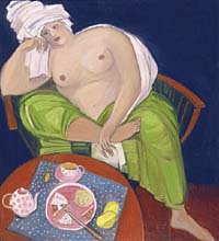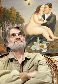 <Вечерние торги современного искусства – 11 ноября 2008 г. в Нью-Йорке <Ричард Принс представлен на выставке картиной «Медсестра из Эверглэйда» 2003 г. (эстимейт $4/6 млн.). На фото, сделанном в Барвихе, где год назад состоялся московский дебют галереи Гагозьяна, картина слева. Ю.П.> |