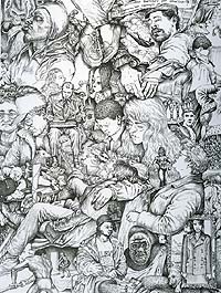 <<4 сентября - 1 октября 2008 Музей актуального искусства ART4.ru представляет выставку Алексея Сундукова. Сундуков создает прессованные, перенасыщенные, перенаселенные полотна; он архитектор-монументалист, вынужденный работать с ограниченной площадью, поэтому почти ювелир: между лицами, фигурами, фрагментами тел на его картинам не остается ни миллиметра зазора; некоторые сюжеты различимы исключительно с помощью лупы. Он фантастически профессиональный, точный, самобытный портретист – десятилетиями зарисовывает людей в метро и на улицах, наблюдает, выхватывает суть, характер, самую запоминающуюся мимическую особенность – и громоздит затем свои бесконечные миры, изобильные, тесные, потрясающие. К открытию выставки подготовлен каталог Алексея Сундукова – от фрагментов записных книжек до полноцветных полотен художника> |