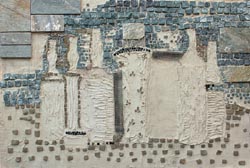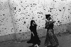 Чечня. Грозный. 7/1996. Обстрелянная шрапнелью стенка центрального выставочного зала.