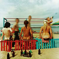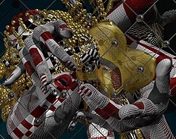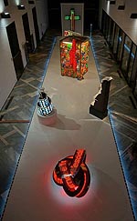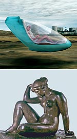 Группа Recycle, первые российские художники эпохи товарного изобилия и вездесущего гламура, действительно заняты переработкой: банального, обреченного на простое и короткое существование пластика — в искусство, вечных сюжетов — в современные материалы, разумного — в вечное, банального — в увлекательное. Созданные ими роскошные цветные витражи при ближайшем рассмотрении оказываются искусной комбинацией шпажек для канапе, в «Саркофаге» мгновенно опознается мусорный контейнер — античный по форме, соцреалистический по содержанию, — их очень современные «Реки» возникают из текучих, извивающихся кабелей. Непросто прорваться сквозь все эти трансформации создания и модификации материи, но бороться надо — и вот сквозь слои прозрачной пленки тянутся к свету и свободе фигуры, прорывают плотный пластик головы и руки заключенных в синтетический плен персонажей. Не пренебрегая своей утилитарной функцией, объекты равняются на прекрасное и возвышенное. Герои из истории искусств и товары из супермаркета сливаются в экстазе обновления.
