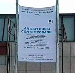 <Афиша выставки «Artisti Russi Contemporanei» в Museo d'Arte Contemporanea Luigi Pecci в Прато. 10 февраля 1990 года>