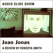<<Обозреватель NYTimes Роберта Смит считает, что всякий интересующийся искусством последних 30 и предстоящих 30 лет, прото-таки должен увидеть выставку Joan Jonas "5 работ 1976 - 2003" в Queens Museum of Art (с 14 декабря до 14 марта).   Из последних работ Joans наиболее известна инсталляция и перформанс Lines in the Sand (2002, Documenta11), основанная на эпической поэме “Helen in Egypt” (1951-55) Хильды Дулитл (Hilda Doolittle).