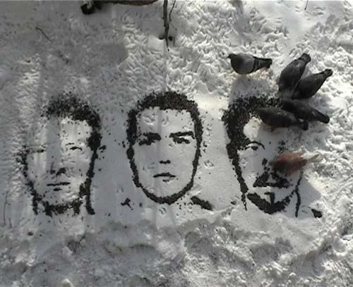 Плохие мальчики синхронно запихивают в рот игрушечные самолеты, повязывают на головы черные кальсоны и засовывают за пояс по батону булки. Вот вам авиационная атака на WTC, а вот - шахидки-смертницы. Угадали? Пародийно, в духе балаганного театра, с его грубым юмором и незамысловатыми сюжетами, интерпретировано телевидение в творчестве «Синих носов». В форме короткой инсценировки Вячеслав Мизин и Александр Шабуров представляют горячие события последних лет («Русские шарады», 2004 г.), при этом цинично передразнивая форму, в какой эти события обычно преподносятся телезрителю. Художники показывают, что мир, предложенный человечеству через телевизионную картинку, – не ненастоящий и заслуживает осмеяния.