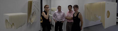 все же продолжается. В пятницу 7 июля открылись две выставки. Молодая берлинская галерея "С. Wichtendahl. galerie (www.wichtendahl.de) представила выставку бумажных объектов немецкой художницы Angela Glajcar. Белая бумага ручной отливки оборванными кусками складывалась в интересные бумажные конструкции, cкульптуры прямоугольных объемов заполнили галерею причудливыми био формами. В прошлом году в стенах этой галереи была выставка черно-белых скульптур из бумаги этой же художницы. Обе выставки дают представление о творчестве интересного молодого автора. ![]() На фотографии объекты из бумаги, госпожа С. Wichtendahl (справа) и художница Angela Glajcar (слева) празднуют успех новой выставки. Пафосная галерея "Thomas Schulte (www.galeriethomasschulte.de) открыла выставку в своем новом помещении. Галерея перебралась из западной части Берлина в более демократичную восточную. Помещение, правда, осталось такое же роскошное как прошлое. Thomas Schulte занимается международным актуальным искусством. Это видеоарт, инсталляции, цифровая фотография. Экспозиция под названием "MAVING ON:MOTION" представила работы художников работающих с этой галереей. ![]() На фотографии галерея "Thomas Schulte и фотографии работ с выставки. <<Michail Molochnikov из Берлина> |