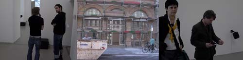 собственным оцифрованным изображением. Все многочисленные персонажи Микеланжело были выполненными MIAO XIAOCHUN в программе 3D и являлись автопортретами самого китайского художника. На выставке помимо черно-белых полотен был представлен видео фильм, повествующий о жизни на небесах. ![]() На фотографии картины с выставки и последняя из фотографий - дом, в котором весь третий этаж занимает галерея Alexander Ochs. <Берлинская галерея "DAAD"(www.daad.de) представила выставку BUILDING TRANSMISSIONS (www.buildingtransmissions.com). Входя через реставрируемое здание, вглубь галереи, попадаешь в большое светлое пространство с маленькими музыкальными колонками, раскиданными на белых стенах галереи. Из колонок идут сообщения о сводках погоды и фон, толи грозы с ураганом, толи торнадо. Плюс смешная звуковая инсталляция для подростков любящих технику. Хочется написать еще о галерее, которая работает в рамках культурной программы известного фонда по поддержке художников и культурных некоммерческих инициатив. Многие иностранные, в том числе и русские художники тоже имели стипендию "DAAD на реализацию своих проектов. Эта выставка галереи проходит в рамках фестиваля sonambiente berlin 2006> ![]() На фотографиях люди слушающие сводки погоды в галерее "DAAD". <<Michail Molochnikov из Берлина> |