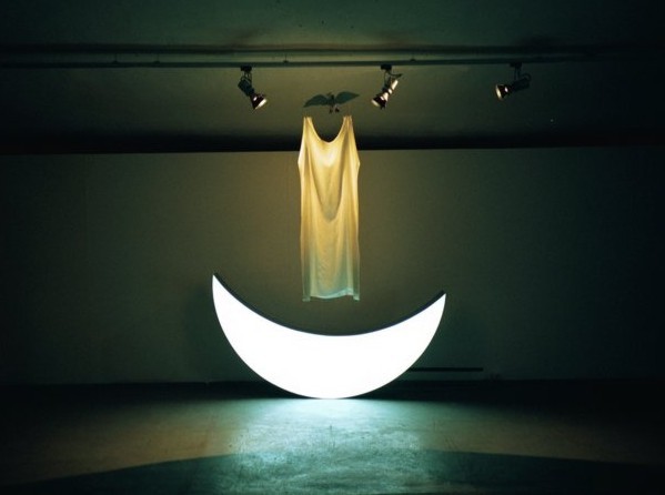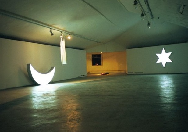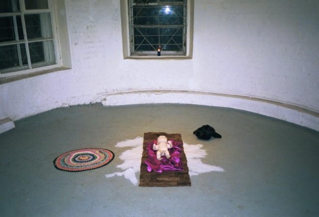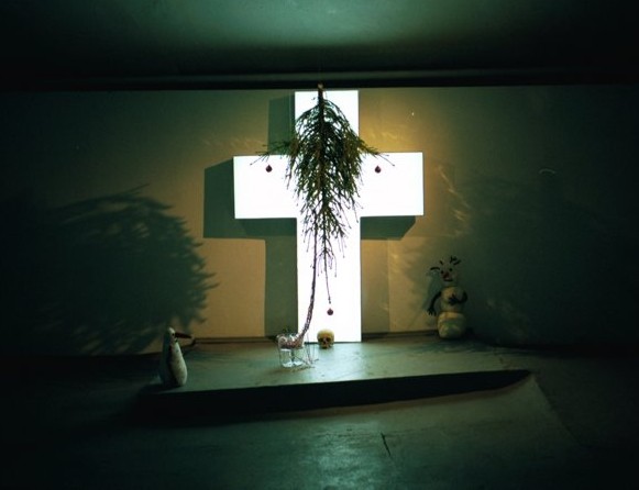 <<С 19 декабря по 7 января 2004 года в ГЦСИ Леонид Тишков “Apocryphos”. Объекты, видео. Инсталляции “Рождество” (с муляжем младенца для студентов-медиков), “Благовещение” (со сперматозоидом из семечка ели), “Распятие” (с настоящим черепом) и проч. В канун Нового Года и праздников Рождества московский художник Леонид Тишков представляет  выставку «Αποκρυφος», рассказывающую историю жизни рождественской елки - святого дерева - как живого существа. Соединяя образы памяти о детстве и христианские символы, используя для своих рукотворных объектов старую семейную одежду, автор  создает волшебные сцены рождественского вертепа. Зрители выставки, поднимающиеся на самый верхний этаж – «мансарду» выставочного пространства, попадают как бы в преддверие небес, где сияют Месяц, Звезда и Крест. Уже там, идя на свет Вифлеемской Звезды, они невольно становятся пастухами или волхвами, пришедшими поклониться младенцу Иисусу. Выставка «Αποκρυφος» еще одно обращение художника к теме сакрального, попытка представить мир и всё в этом мире как божественную субстанцию.